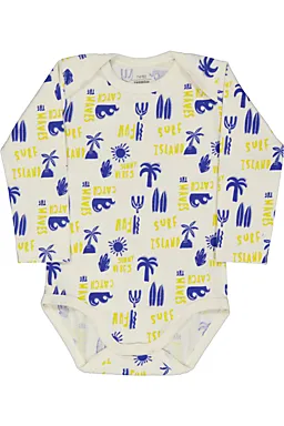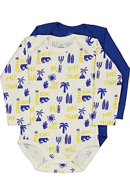 Deze set van twee rompertjes voor baby's heeft lange mouwen. Eén rompertje is effen donkerblauw, het andere heeft een vrolijke print met gele en blauwe figuren, zoals palmbomen en duikbrillen. De zachte single jersey voelt prettig aan op de huid, zodat je kleintje comfortabel kan bewegen. Dankzij de praktische drukknoopsluiting trek je de rompertjes makkelijk aan en uit.