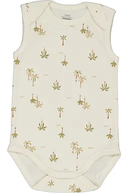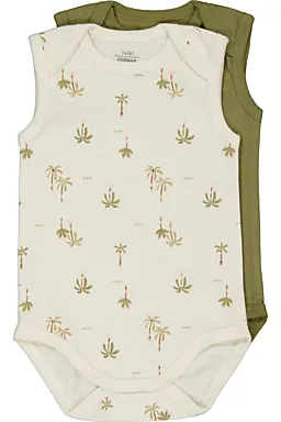 Deze set bestaat uit twee mouwloze babyrompertjes die gemaakt zijn van single jersey. Eén rompertje is effen groen, het andere heeft een crème kleur met palmbomenprint. De zachte, soepele stof voelt prettig aan op de huid, zodat je baby comfortabel kan bewegen. Dankzij de drukknoopsluiting kun je het rompertje makkelijk aan- en uittrekken bij het verschonen.
