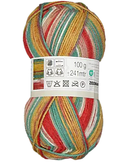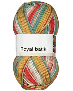 Dit Royal batik breigaren heeft de kleuren rood, geel, wit en groen. Een bol weegt 100 gram en heeft een lengte van 241 meter, zodat je voldoende draad hebt voor verschillende brei- of haakprojecten. Een proeflapje van 10 x 10 cm bevat 18 steken en 28 naalden. Het garen is geschikt voor breinaalden met dikte 4-5 en haaknaalden met dikte 5-6.