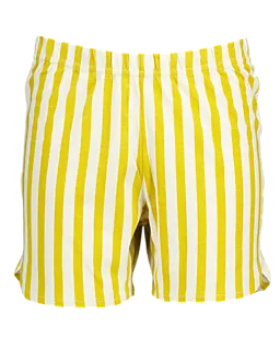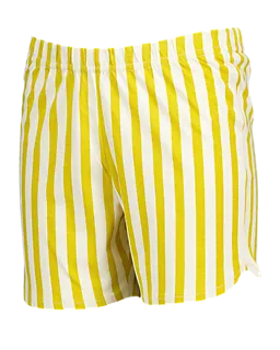 Deze beige meisjes short heeft verticale geel-witte strepen en korte pijpen, waardoor hij luchtig zit op warme dagen. De elastische tailleband rekt zacht mee, zodat je de short makkelijk aantrekt en hij goed blijft zitten. Het single jersey materiaal voelt soepel aan, waardoor je prettig kunt bewegen. Dit maakt de short fijn voor dagelijks gebruik wanneer het warm is.