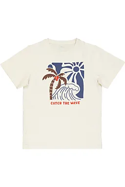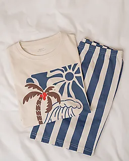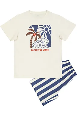 Deze beige jongens shortama bestaat uit een T-shirt met korte mouwen en een ronde hals. Op het T-shirt zie je een palmboom, een golf en de tekst 'Catch the wave'. De korte broek heeft donkerblauwe en witte strepen. De zachte katoenen stof draagt prettig en voelt comfortabel aan op je huid, zodat je fijn slaapt op warme nachten.