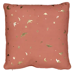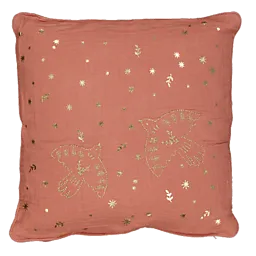 Dit vierkante sierkussen is gemaakt van 100% katoen. De stof is zacht en comfortabel. Het kussen heeft een oranje kleur met goudkleurige details, zoals vlinders en kleine sterretjes. Ideaal als extra steun op de bank of stoel. De vrolijke print zorgt voor een warme, gezellige sfeer in de woonkamer.