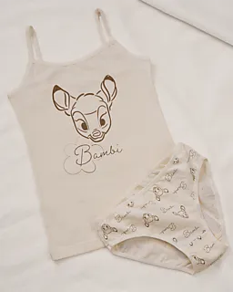 Deze set bestaat uit twee beige meisjes slips met een allover Bambi print. De zachte, gladde single jersey stof voelt prettig aan op je huid, zodat je de slips comfortabel draagt. Dankzij de elastische tailleband blijven ze goed zitten als je beweegt.