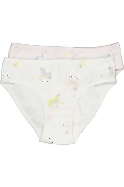 Deze set bestaat uit twee witte meisjesslips met een vrolijk patroon van eenhoorns en kleine figuurtjes. De zachte mix van katoen en elastaan voelt prettig aan en is licht rekbaar, zodat de slips goed aansluiten. Dankzij de elastische tailleband trek je ze makkelijk aan en blijven ze op hun plaats.