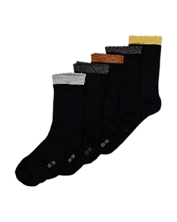 Deze set bestaat uit vijf paar dames sokken in donkere kleuren, elk met een andere kleur rand aan de bovenkant. De aansluitende boorden zorgen ervoor dat de sokken goed blijven zitten tijdens het dragen, zodat ze prettig aanvoelen bij dagelijks gebruik.