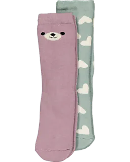 Deze set van twee sokken voor jongens en meisjes heeft een roze en een lichtgroene kleur. Het ene paar heeft een dierengezicht, het andere paar een patroon van witte hartjes. Ze zijn gemaakt van katoen, polyester en elastaan, waardoor ze zacht aanvoelen en licht meerekken. Zo sluiten de sokken prettig aan en zitten ze comfortabel om je voeten.