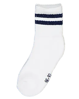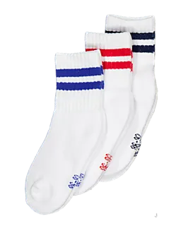 Deze set van 3 witte babysokken heeft een sportieve uitstraling dankzij de twee opvallende strepen in donkerblauw, rood en blauw op de schacht. De sokken zijn gemaakt van een zachte mix van katoen, polyamide en elastaan, waardoor ze prettig aanvoelen en licht mee rekken. De geribde boorden sluiten goed aan zodat de sokken comfortabel blijven zitten tijdens het dragen.