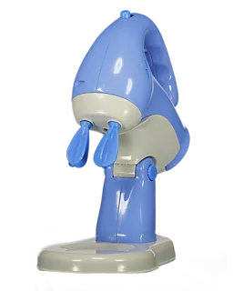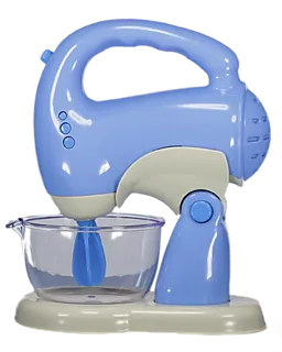 Speelgoed kookgerei in blauw en wit, bestaande uit een handmixer met schaal. De mixer heeft een handvat, drie knoppen en een stevige voet, waardoor hij stabiel blijft staan. Door het eenvoudige ontwerp is het makkelijk te gebruiken in een speelkeuken. Zo kunnen jongens en meisjes hun fantasie gebruiken en samen spelen alsof ze aan het bakken zijn.