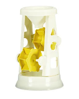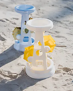 Dit strandspeelgoed heeft een wit frame met twee opvallende gele wielen. Dankzij de open structuur met ronde en driehoekige uitsparingen kun je er gemakkelijk zand of water in gieten, waardoor de wielen gaan draaien. Door het compacte formaat neem je het eenvoudig mee naar het strand of de zandbak, zodat kinderen kunnen spelen met zand en water.