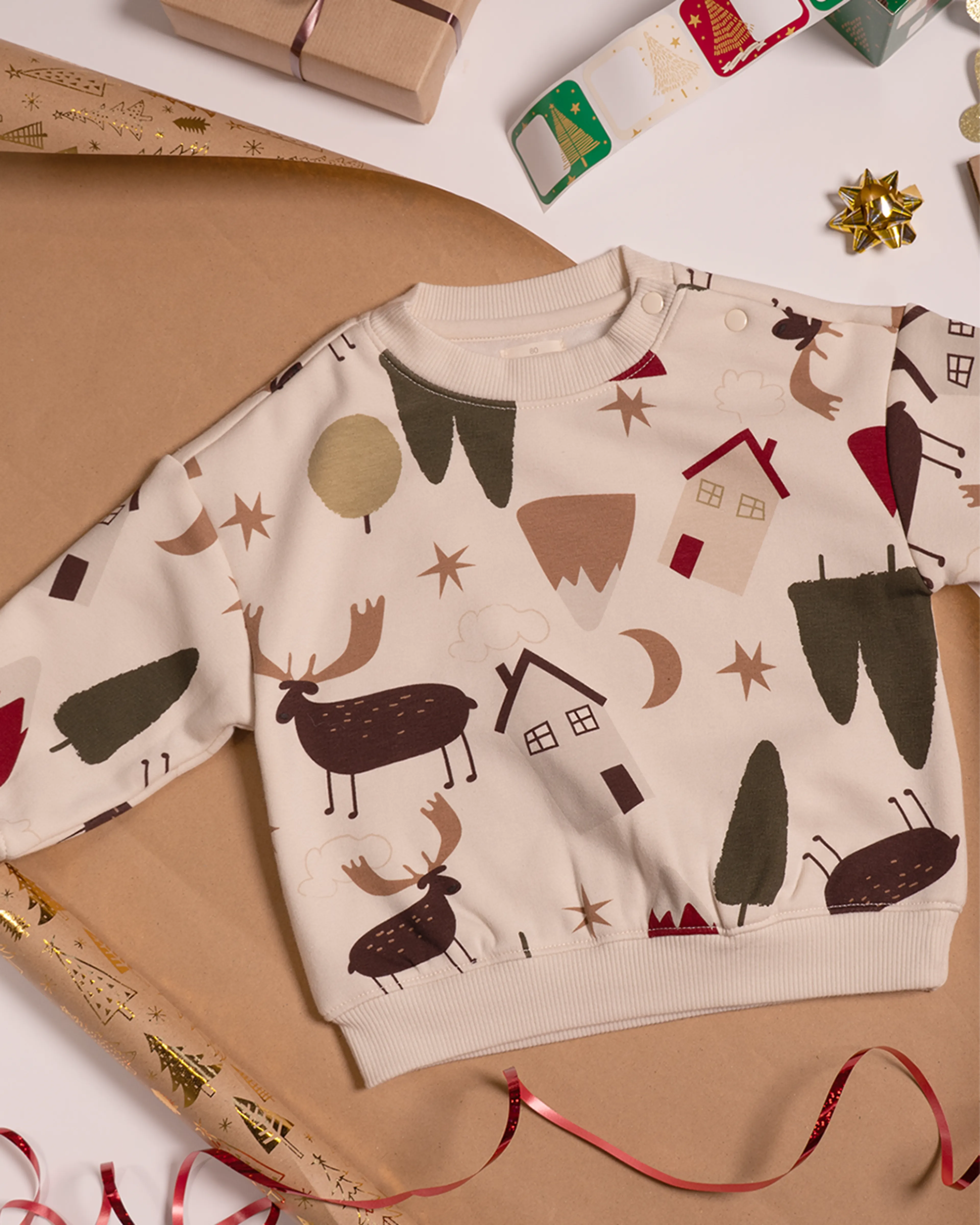Deze beige sweater voor baby's is gemaakt van zacht materiaal en heeft een comfortabele, losse pasvorm. De binnenkant voelt aangenaam aan op de huid. Dankzij de drukknopen op de schouder gaat aan- en uittrekken makkelijk. Brede boorden bij de mouwen en onderkant zorgen voor een goede aansluiting. De sweater is versierd met een kerstboom en rode ster, leuk voor de feestdagen.