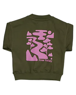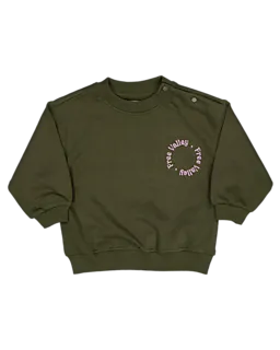 Deze groene babysweater is gemaakt van zachte french terry. De sweater heeft lange mouwen en een ronde hals met twee drukknoopjes op de schouder, waardoor je hem gemakkelijk aan- en uitdoet. Op de borst staat een kleine print met de woorden 'free happy' in een cirkel. De boorden aan de mouwen en onderkant zorgen voor een comfortabele pasvorm.