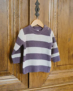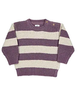 Deze paarse babytrui is gemaakt van 100% polyester en heeft brede horizontale strepen in paars en gebroken wit. De trui heeft een ronde hals en lange mouwen. Op de schouder zitten twee houten knoopjes, waardoor het aan- en uittrekken makkelijker gaat. De boorden aan de mouwen en onderkant zijn geribd voor extra comfort en een goede pasvorm.