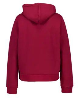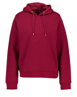 Deze rode sweater heeft een capuchon met aantrekkoorden en lange mouwen. De stof bestaat uit 65% polyester en 35% katoen, wat zorgt voor een soepele en comfortabele draagervaring. De mouwuiteinden en onderkant zijn afgewerkt met een brede boord. Dankzij het eenvoudige ontwerp is deze sweater praktisch en makkelijk te combineren met andere kledingstukken.