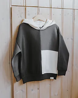 Deze jongenssweater heeft lange mouwen en een capuchon in de kleur wit. Het ontwerp bestaat uit meerdere kleuren: zwart, donkergrijs en wit. De onderkant en mouwen zijn afgewerkt met een geribde boord voor een goede pasvorm.