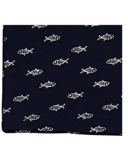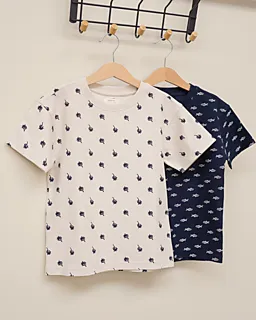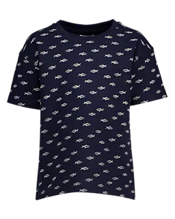Dit donkerblauwe T-shirt voor jongens heeft korte mouwen en een ronde hals, waardoor je het makkelijk aantrekt. Het T-shirt heeft een patroon van kleine witte visjes, wat zorgt voor een speelse uitstraling. Dankzij de rechte pasvorm en de soepele piqué stof zit het shirt prettig, zodat je het comfortabel kunt dragen op warme dagen of tijdens het spelen. Je draagt het los of onder een vest.
