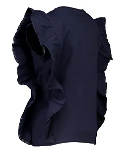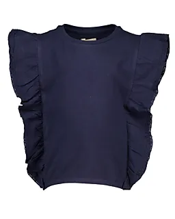 Dit donkerblauwe meisjes T-shirt is gemaakt van 100% katoen en heeft een ronde hals, waardoor het zacht aanvoelt op je huid. De stof is single jersey, zodat het shirt soepel draagt. De brede volant langs de armsgaten geeft een speels effect en het mouwloze model zorgt ervoor dat je makkelijk kunt bewegen wanneer het warm is.