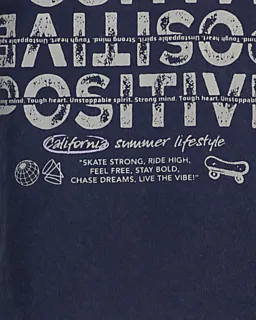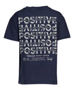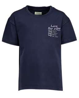 Dit donkerblauwe T-shirt voor jongens heeft korte mouwen en een ronde hals, waardoor je het makkelijk aantrekt en het prettig zit. Op de borst staat een witte tekst met een klein grafisch detail. Door de effen kleur combineer je het shirt eenvoudig met een broek of short, zodat het geschikt is voor elke dag.
