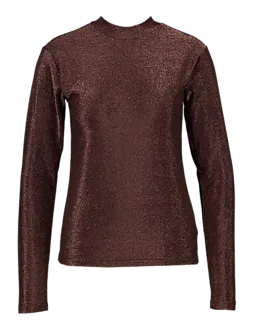 Dit bruine dames T-shirt heeft een glanzende uitstraling door het gebruik van metaaldraad in de stof. Het shirt heeft lange mouwen en een ronde hals. De mix van polyamide, metaaldraad en elastaan zorgt voor een soepele en licht rekbare pasvorm. Fijn om te dragen op momenten waarop je je outfit een subtiele, opvallende touch wilt geven.