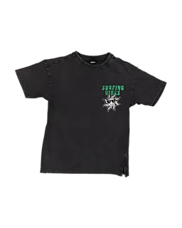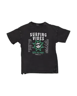 Dit grijze jongens T-shirt is gemaakt van 100% katoen, waardoor het zacht en ademend aanvoelt. De korte mouwen geven je veel bewegingsvrijheid, zodat je prettig kunt spelen of ontspannen. Op de borst staat een kleine print met de tekst ‘SURFING VIBES’ en een tekening, wat zorgt voor een speelse uitstraling. Door de effen kleur combineer je het makkelijk met een jeans of korte broek.