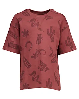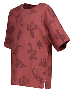 Dit paarse jongens T-shirt heeft een all-over print met cactussen, hoefijzers en dierenfiguren. De rechte pasvorm en de ronde hals helpen je het T-shirt makkelijk aan te trekken en maken het prettig om te dragen. Dankzij de korte mouwen heb je veel bewegingsvrijheid, zodat je fijn kunt spelen of ontspannen. Het rustige ontwerp past bij veel momenten.