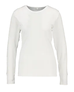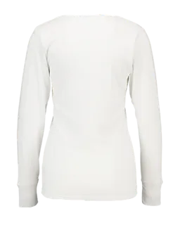 Dit witte dames T-shirt heeft lange mouwen en een ronde hals. De stof bestaat voor de helft uit gerecycled polyester en voor de helft uit polyester. Het shirt voelt licht en soepel aan en de ribstructuur zorgt voor een comfortabele pasvorm. Door de effen kleur is dit T-shirt makkelijk te combineren met andere kledingstukken.