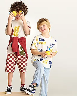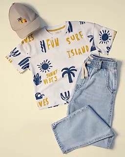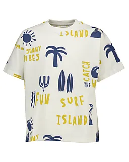 Dit witte T-shirt voor jongens heeft korte mouwen en een ronde hals, zodat je het makkelijk aantrekt op warme dagen. Op het shirt staan blauwe en gele opdrukken met palmbomen, surfplanken en teksten als SURF, FUN en ISLAND. Het is gemaakt van single jersey waardoor het soepel en licht aanvoelt, zodat je je vrij kunt bewegen als het warm is.