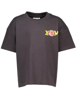 Dit zwarte T-shirt voor jongens en meisjes heeft korte mouwen en een ronde hals, waardoor het prettig draagt op warme dagen. Op de borst zit een geel met rood figuur dat het shirt een speelse uitstraling geeft. De geribde stof voelt zacht aan en beweegt licht mee, zodat je gemakkelijk kunt bewegen. Door het eenvoudige ontwerp combineer je het gemakkelijk met een spijkerbroek of korte broek.