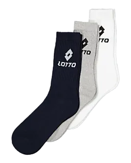 Deze set bestaat uit drie paar Lotto heren tennissokken in de kleuren donkerblauw, lichtgrijs en wit. De sokken zijn gemaakt van een mix van katoen, polyester en elastaan, waardoor ze zacht zijn en licht meerekken.