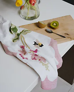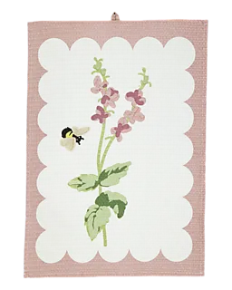 Deze lila theedoek is gemaakt van 100% katoen en heeft een bloemenprint met een klein bijtje. De stof neemt goed vocht op, waardoor je je servies makkelijk afdroogt. Het ophanglusje bovenaan maakt dat je de doek snel weg hangt, zodat hij binnen handbereik blijft in de keuken. Dankzij het ruime formaat werkt hij prettig tijdens het dagelijkse afdrogen.