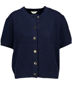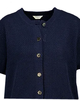 Dit donkerblauwe damesvest is gebreid en heeft korte mouwen. Dankzij de ronde hals en de knoopsluiting aan de voorkant trek je het vest gemakkelijk aan en uit. De stof is gemaakt van katoen en acryl, waardoor het vest zacht aanvoelt. Door de structuur van het breisel is het vest licht en luchtig, zodat je het prettig draagt op mildere dagen.
