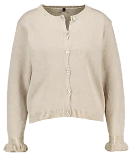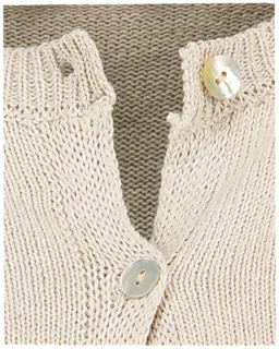 Dit beige vest heeft een ronde hals en sluit aan de voorkant met knoopjes. De lange mouwen zijn afgewerkt met een ribboord, waardoor ze goed blijven zitten. Door het eenvoudige ontwerp is het vest makkelijk te combineren met andere kleding. Gemaakt van een mix met gerecycled materiaal.