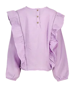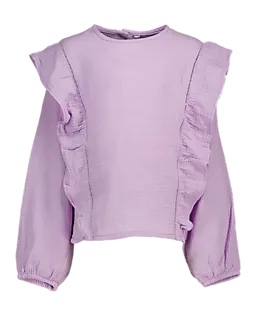 Esta blusa lilás para menina é feita de 100% algodão e tem mangas compridas. Os folhos à frente dão um detalhe divertido, o que deixa a blusa com um ar alegre. Graças ao tecido macio e respirável, a blusa é confortável para a pele. O corte direito e os punhos elásticos tornam mais fácil vestir e usar a blusa.