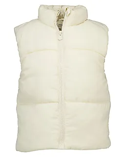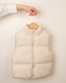 Este colete bege para menina não tem mangas e fecha à frente com um fecho, o que facilita vestir. O enchimento acolchoado é macio e confortável, bom para usar por cima de uma camisola ou t-shirt quando está mais frio. A gola alta mantém o pescoço mais quente. A cor lisa é fácil de combinar.