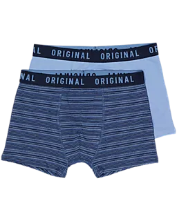 Este conjunto é composto por dois boxers para homem: uns azuis-claros e outros azuis-escuros com riscas. O tecido macio em jersey simples com algodão e um pouco de elastano é confortável e estica ligeiramente. O cós elástico largo garante um bom ajuste, para que os boxers se mantenham bem no lugar. Graças ao design liso e às riscas, é fácil alternar entre eles.