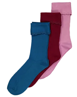 Esta caixa de oferta contém três pares de meias nas cores azul, bordô e rosa. As meias são feitas de um tecido macio e têm um pequeno detalhe ondulado na parte superior. Devido à alta percentagem de algodão, são confortáveis de usar. Adequadas para o uso diário e fáceis de combinar com diferentes roupas. Práticas para quem gosta de variar e de meias macias.