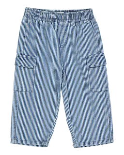 Estas calças de bebé com riscas azul e branco são feitas de denim leve e têm uma cintura elástica, o que facilita vestir e faz com que fiquem bem no lugar. Os dois bolsos grandes de lado dão espaço para pequenos objetos. O tecido leve torna as calças confortáveis, sobretudo em dias quentes.