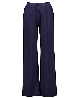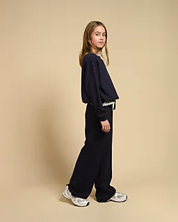 Estas calças azul‑escuras para menina têm perna larga e cintura elástica com cordão, o que facilita vestir e faz com que fiquem bem no corpo. Os dois bolsos frontais dão espaço para pequenos objetos. O corte longo e direito cai de forma solta ao longo das pernas, para que se possa mover confortavelmente na escola ou a brincar.