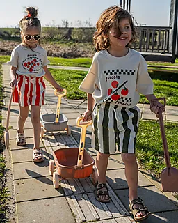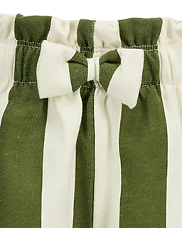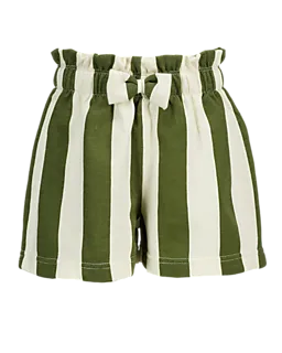 Estes calções curtos para menina têm riscas largas e verticais em verde e branco. A cintura elástica com laço à frente facilita vestir os calções e faz com que fiquem confortáveis. O tecido suave em french terry é confortável para a pele, por isso estes calções são agradáveis de usar quando está calor.