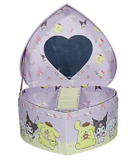 Esta caixa de joias roxa tem formato de coração e é decorada com personagens de desenhos animados conhecidos na tampa. As ilustrações mostram presentes alegres e doces, o que dá um toque divertido à peça. Por ser compacta, permite organizar joias de forma prática e levá-las facilmente para onde quiser. Ideal para guardar anéis, pulseiras ou pequenos acessórios no seu quarto ou durante viagens.