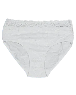 Estas hipster cinzentas-claras para senhora têm um cós elástico largo com borda de renda. O tecido macio é composto por 95% de algodão e um pouco de elastano, o que faz com que as hipster se ajustem facilmente e proporcionem um uso confortável. Com a cintura baixa e o acabamento liso, estas hipster ficam discretas debaixo da roupa.