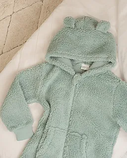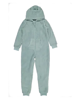 Este macacão verde é feito de 100% poliéster, por isso é macio ao toque. O macacão tem um capuz e fecha facilmente com um fecho à frente, o que o torna prático de vestir. As mangas compridas e as pernas têm punhos, por isso assentam bem. O tecido macio faz com que o macacão seja confortável para relaxar.