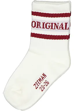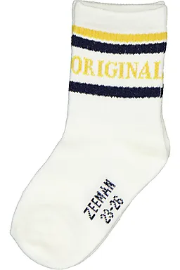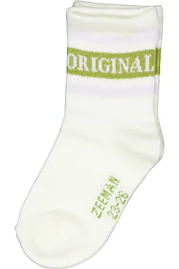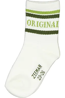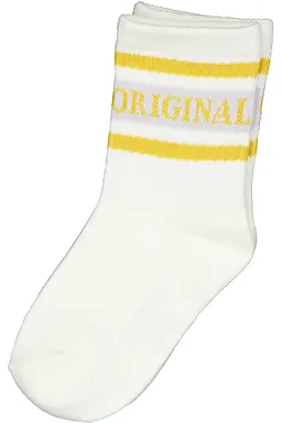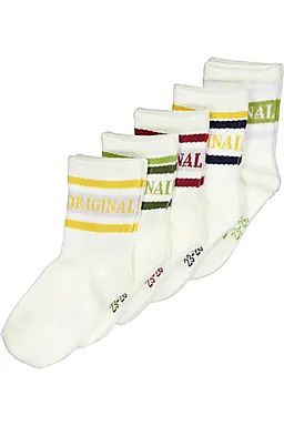 Este conjunto de cinco meias brancas para meninos e meninas tem riscas coloridas e a palavra ORIGINAL na lateral. As meias são feitas de algodão, poliéster e um pouco de elastano, o que lhes dá um toque macio e resistente. Graças a esta combinação de materiais, as meias assentam bem nos pés e esticam ligeiramente, ficando confortáveis durante o uso.