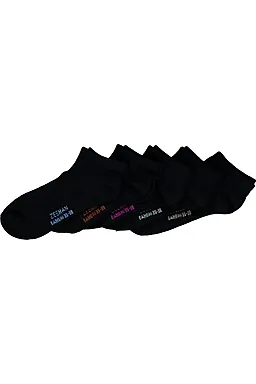 Este conjunto de cinco meias curtas pretas para meninos e meninas tem um formato baixo que fica logo acima da borda do sapato, por isso quase não se vêem quando as usa. A mistura de viscose de bambu, poliéster e elastano é macia e ligeiramente elástica, para que as meias assentem de forma confortável. O pequeno texto colorido na lateral dá um detalhe discreto.