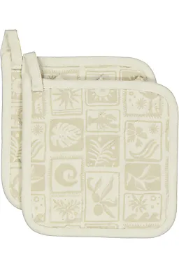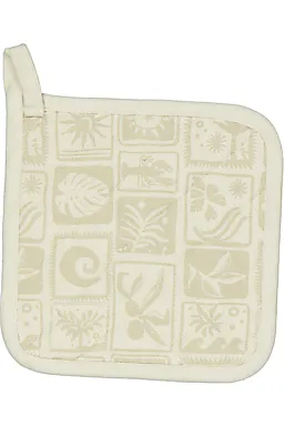 Este conjunto de 2 individuais de cozinha bege tem uma textura tecida com um padrão de quadrados discreto. Medem 20 por 20 centímetros, por isso são fáceis de usar para pegar em panelas quentes. Graças ao laço de tecido, pode pendurá-los facilmente na cozinha, para que os tenha sempre à mão enquanto cozinha.