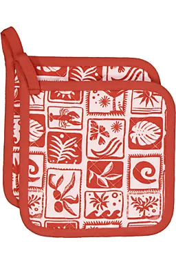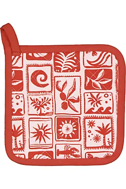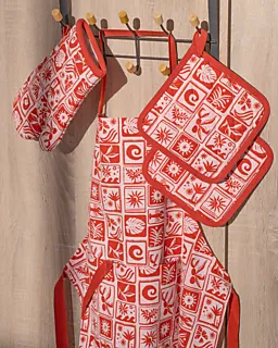 Este conjunto de 2 pegas de panela laranja tem um padrão vermelho e branco com várias formas abstratas e naturais. O exterior é de algodão e o enchimento é de poliéster macio, o que protege bem as suas mãos ao segurar panelas quentes. Com o tamanho de 20 por 20 centímetros, encaixam bem na mão. O laço facilita pendurá-las ao lado do fogão.