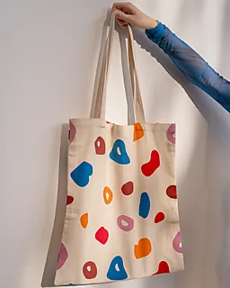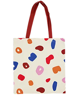 Saco forte de lona com base em tom creme e manchas alegres em vermelho, azul, laranja e rosa. As alças vermelhas tornam o saco fácil de levar ao ombro. Prático para as compras ou para transportar outras coisas. Feito de 100% algodão reciclado. O saco é confortável ao toque e adequado para uso diário.