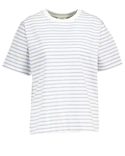Esta t-shirt de senhora tem riscas brancas e azul claro, dando um aspeto fresco ao seu conjunto. O tecido single jersey é macio e leve, o que a torna confortável nos dias quentes. As mangas curtas e a gola redonda mantêm a peça arejada, ideal para usar nos dias quentes ou facilmente combinar com um casaco.
