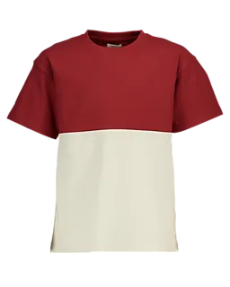 Esta t-shirt bordeaux e branca para rapaz tem mangas curtas e gola redonda, o que dá liberdade de movimento e conforto ao usar. A parte de cima é vermelha e a parte de baixo branca, criando um contraste de cores marcante. O tecido piqué dá um aspeto resistente ao material. Esta t-shirt é agradável para dias quentes ou para atividades desportivas.