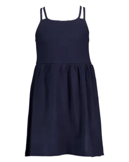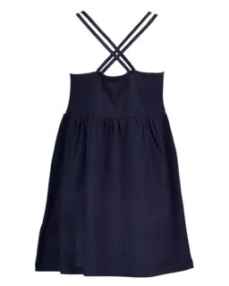 Este vestido azul-escuro para menina é feito de single jersey. Este tecido macio e flexível faz com que o vestido seja confortável de usar e proporciona liberdade de movimentos. O vestido tem alças finas, uma parte superior direita e uma saia larga, franzida e com bastante espaço. A cor lisa permite combinar facilmente com um casaco ou jaqueta. O tecido leve é agradável quando está calor.